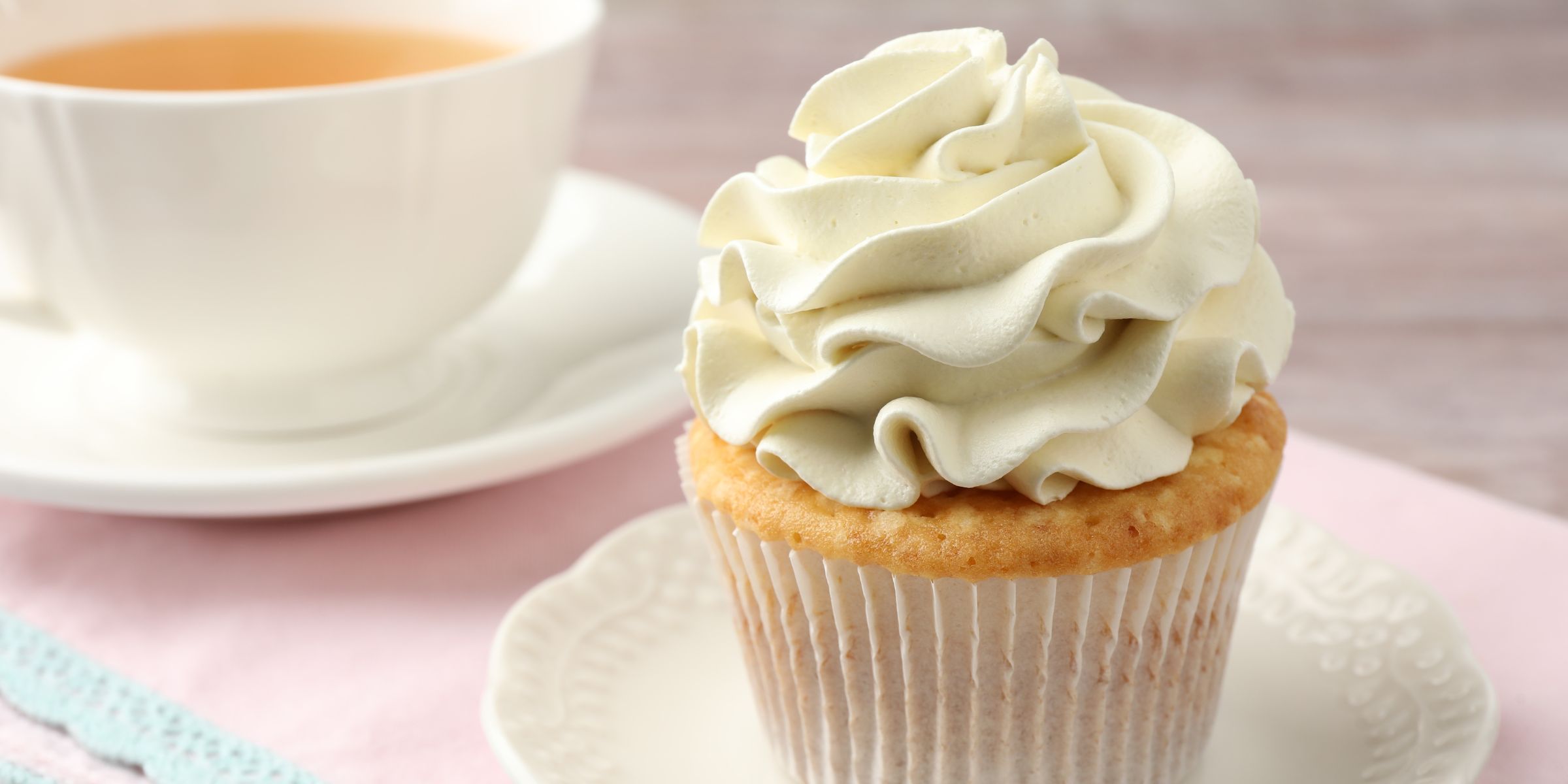 Ich kaufte zwei Vanille-Cupcakes mit rosa Zuckerguss.